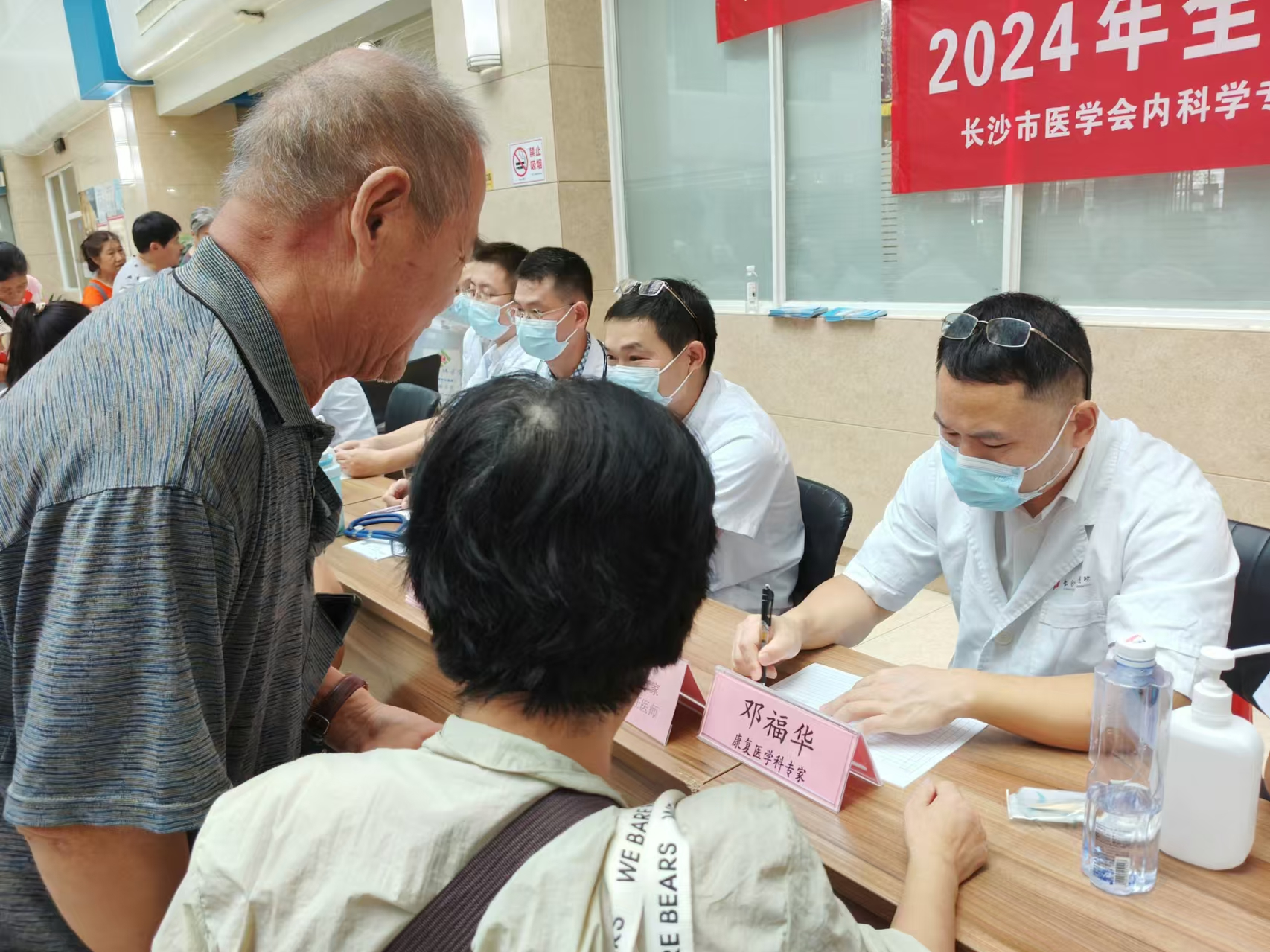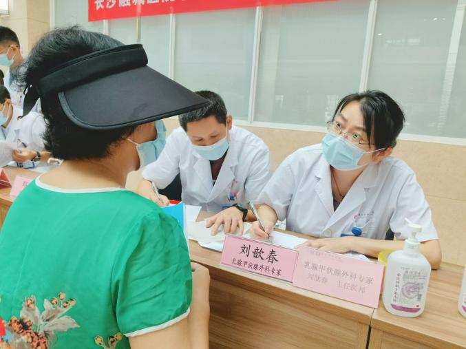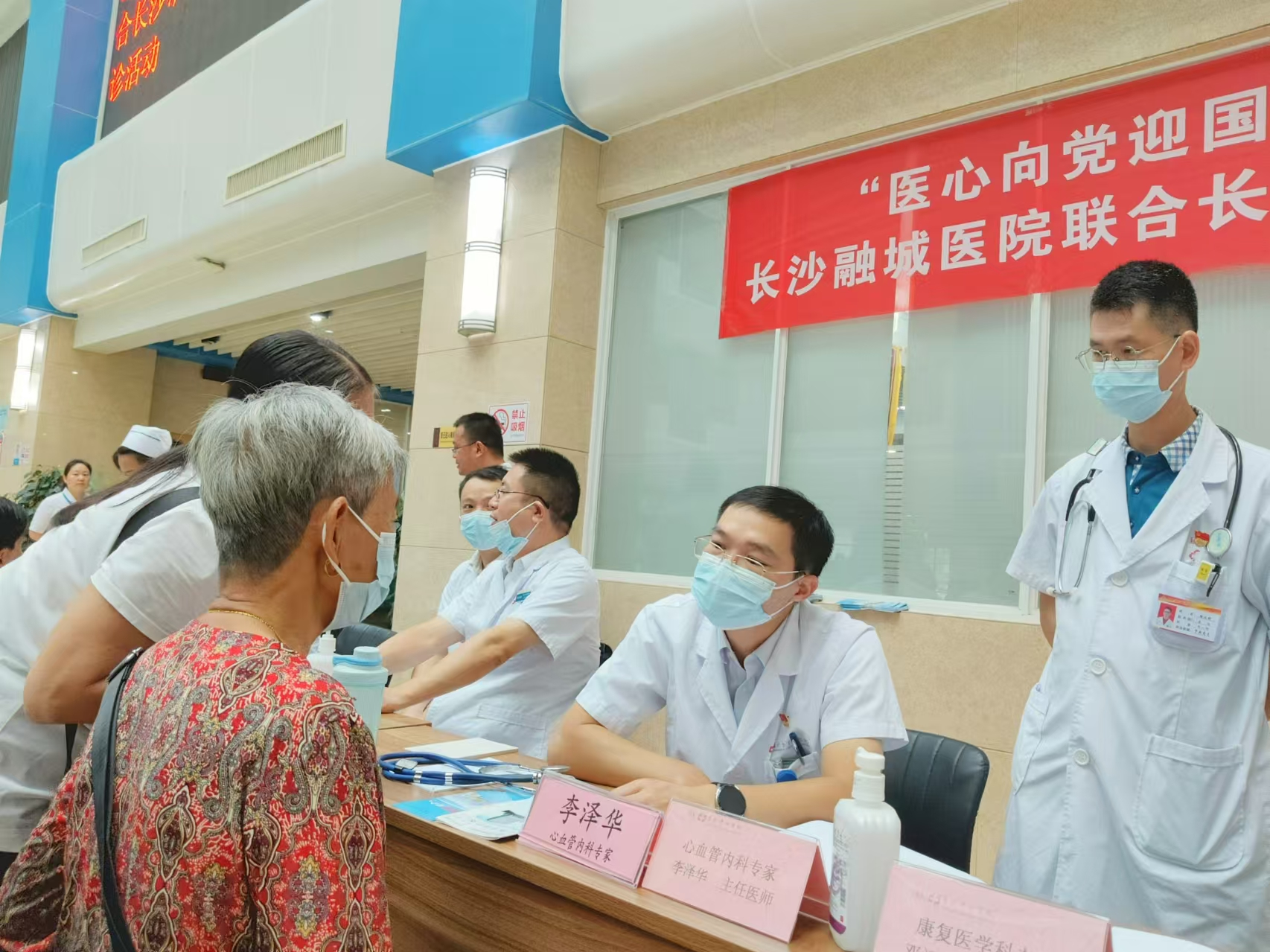 诊疗区内,来自长沙市中心医院的心血管内科李泽华主任医师、呼吸与重症医学科陈剑波主任医师、内分泌科刘婷主任医师、乳腺甲状腺外科刘歆春主任医师、运动医学科李良军副主任医师、康复医学科邓福华副主任医师,与长沙融城医院对口科室的主任和副主任医师们一道,为问诊居民进行面对面的诊疗服务。两院专家认真听主诉、看结果、查体征,结合患者的既往病史给出初步诊断和专业建议,对于需要进一步住院治疗或检查的患者,还会耐心细致地讲解后续就医流程和注意事项。