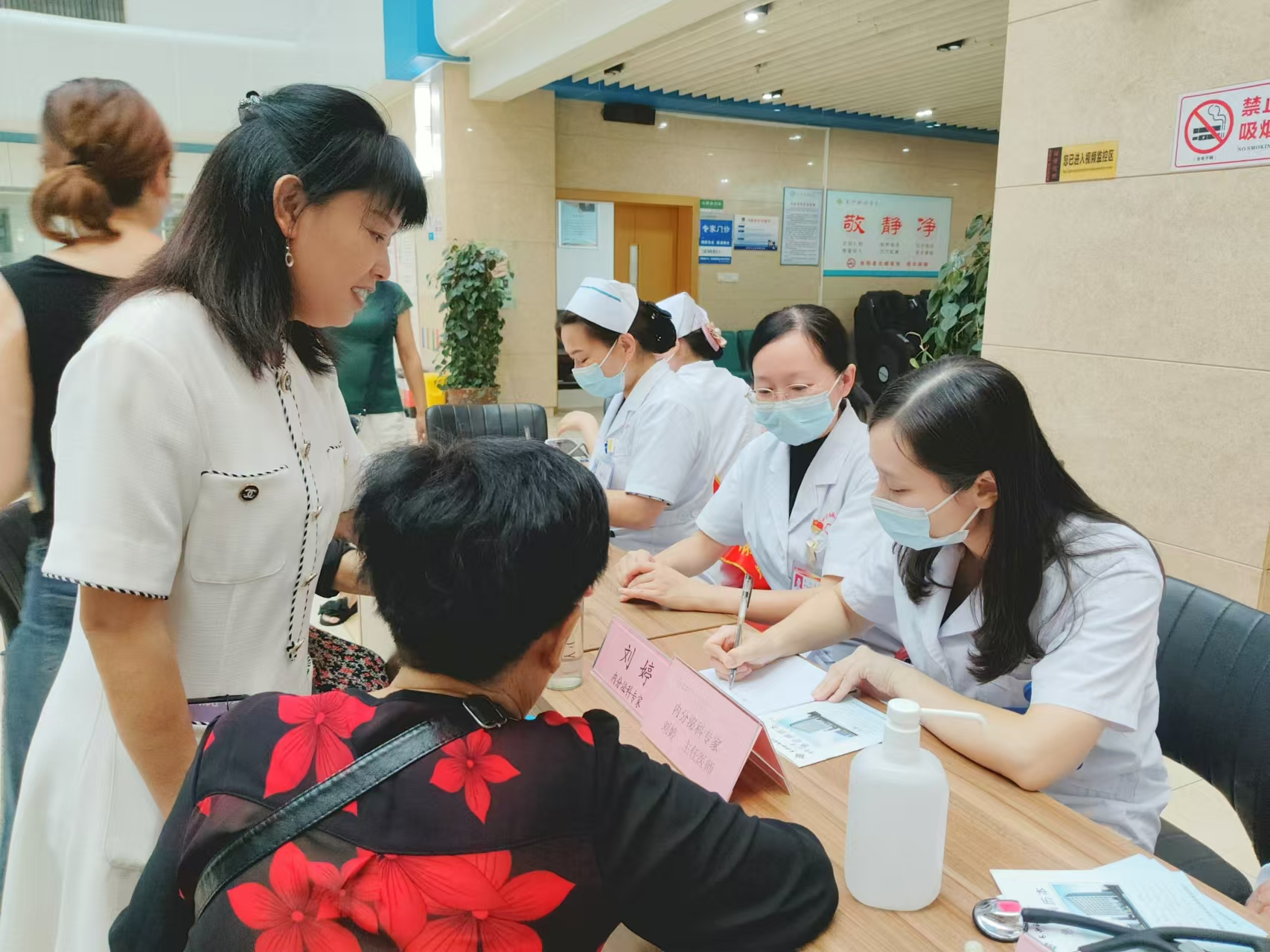 接诊台前,我院资深护士为来自周边社区的居民群众依次登记排号,并进行测血压、血糖等常规检测,之后根据就医需求进行分诊引导。